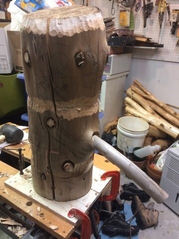 Voici une blague entre voisins. Mes anciens voisins ont un chalet sur le bord du fleuve St-Laurent dans le secteur de Rivière-Ouelle. Ils ont trouvé une bûche sur la grève avec une assez longue branche. Ils me l'ont gardée au cas où je voudrais en faire une sculpture et m'ont expliqué, à la blague, que pour eux la branche représentait un pénis. Bon..., ça ne me tentait pas de sculpter un pénis. J'ai plutôt pensé à faire un Pinocchio, mais je trouvais ce personnage un peu ordinaire et j'avais en tête d'essayer de faire une blague avec le thème du pénis.